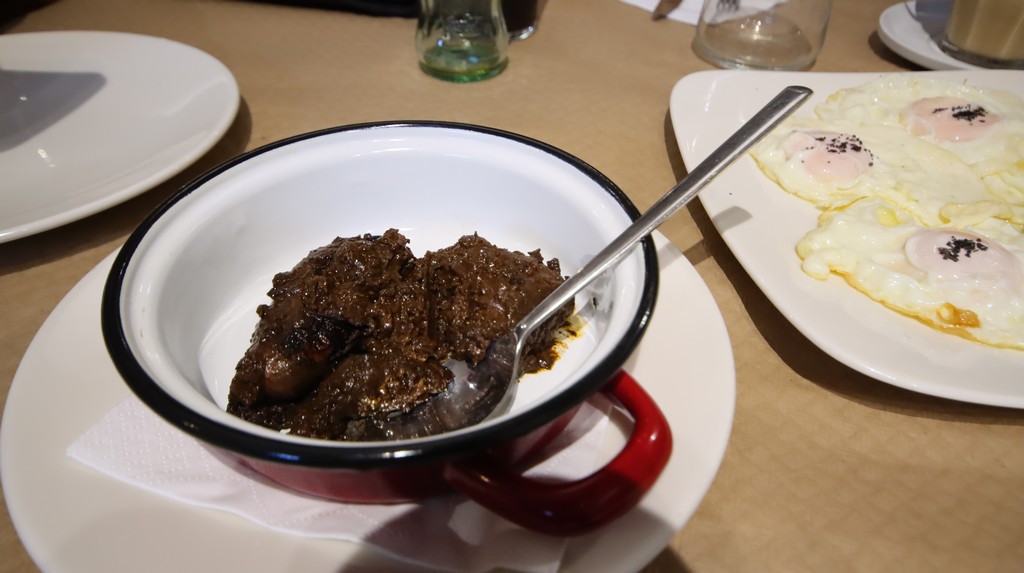 El cierre del desayuno fueron unos callos elaborados con una cocción prolongada que consigue una textura tierna y una salsa espesa, rica en gelatina natural. Este tipo de guiso requiere tiempo y atención. El resultado es un plato que pedía pan y que nos llevó a aprovechar hasta la última cucharada.