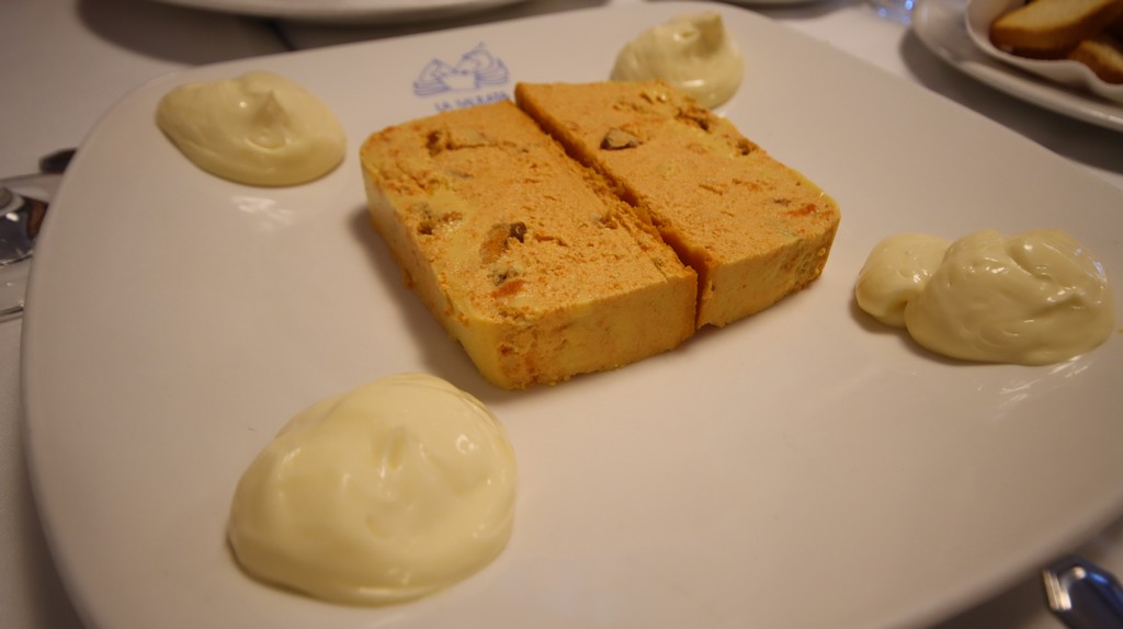 A continuación llega el pastel de centollo, una preparación que recuerda al conocido pastel de pescado, pero sustituyendo el pescado habitual por centollo. Su textura es suave, bien ligada, y permite apreciar el punto dulce del marisco. Es un plato que se disfruta tanto untado en pan como solo, y que aporta un contraste interesante respecto al gazpacho inicial.