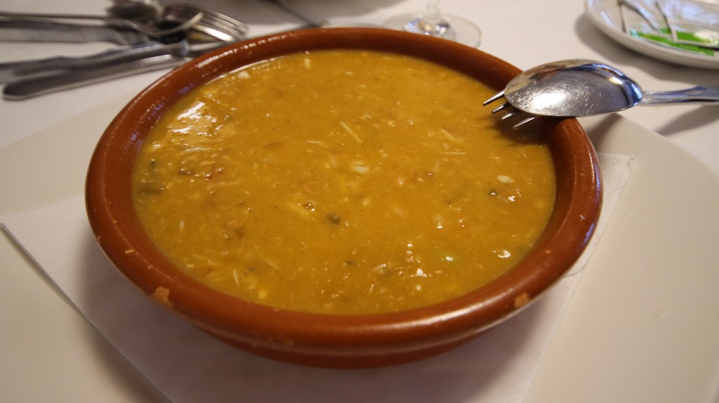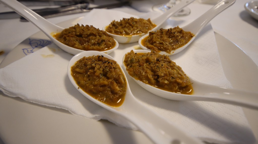 La jornada comienza con un gazpacho de centollo, una preparación que combina la ligereza del gazpacho tradicional con el toque marino del centollo desmigado. La mezcla resulta equilibrada: la base vegetal aporta frescura y el centollo introduce una profundidad que invita a repetir. Es una entrada que funciona muy bien para abrir el apetito sin saturar.