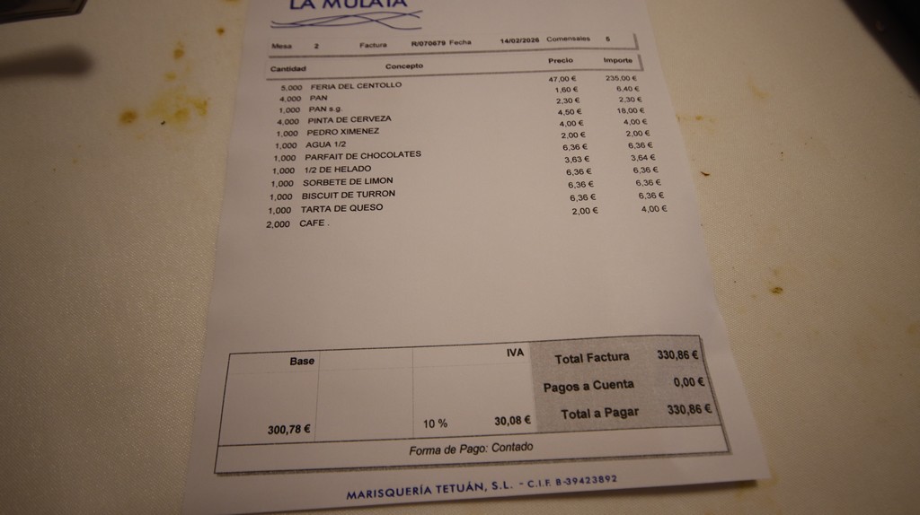 La comida se acompañó con cava y cerveza, y un toque final de PX. El servicio fue atento y constante, algo que siempre suma en jornadas de este tipo. La combinación de buen producto y una cocina que respeta el marisco hace que esta feria siga siendo una referencia para quienes disfrutan del centollo en todas sus formas.