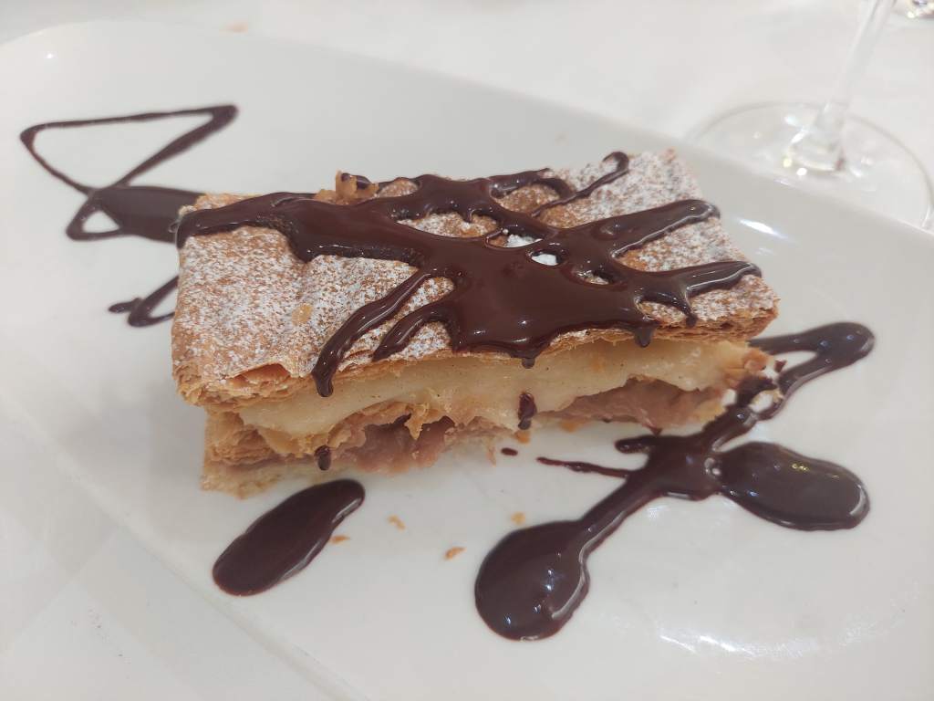 Tartas de queso casera, milhojas de chocolate y crema y varios sorbetes de limón como colofón de una estupenda comida.